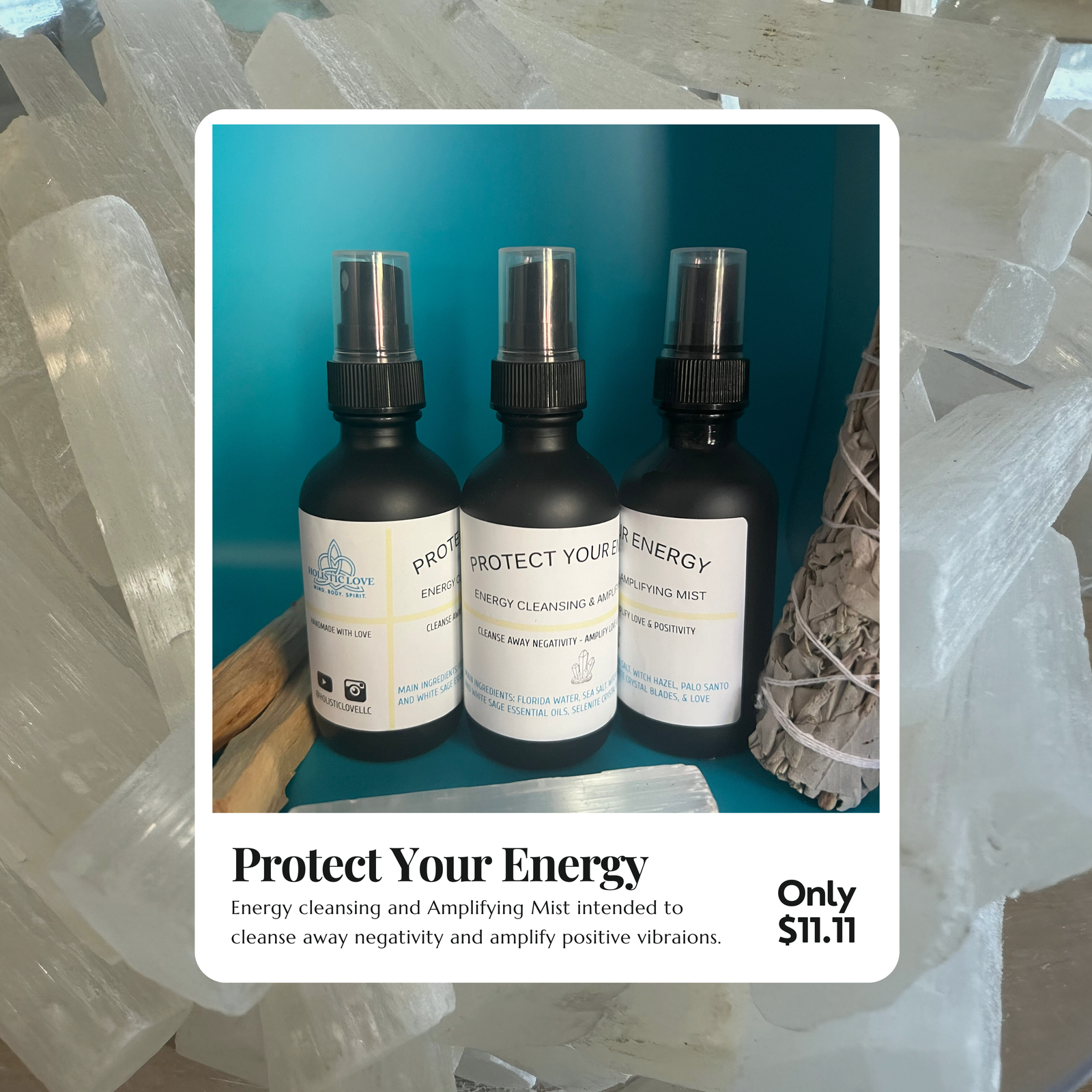 Ingredients: purified water, florida water, sea salt, witch hazel, therapeutic grade palo santo and white sage essential oils, selenite crystal blades